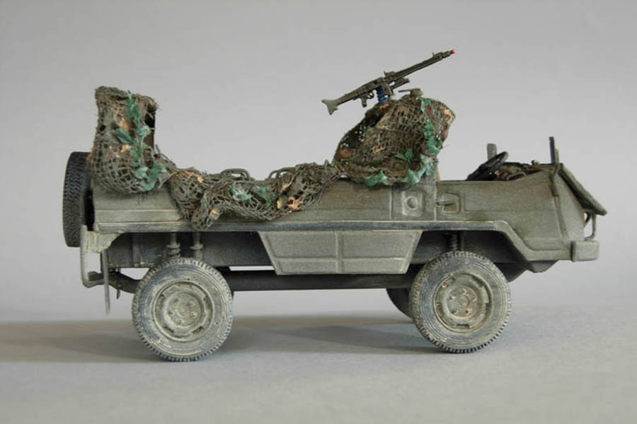 The first challenge was the slightly curved roll bars of the Pinzgauer. Despite days of tension with rubber bands, I couldn't get them to look as they should. In the end, this problem was covered up by the camouflage nets. However, one should not forget the small triangles that are attached at all corners to stiffen the bars.