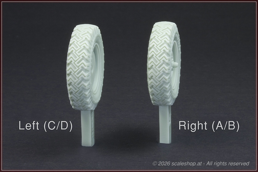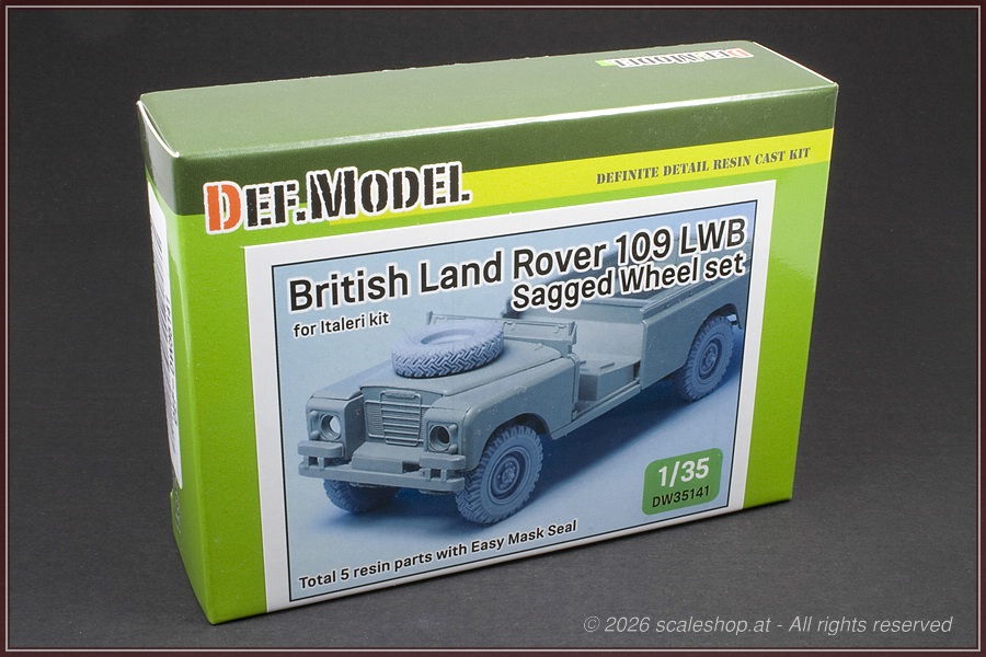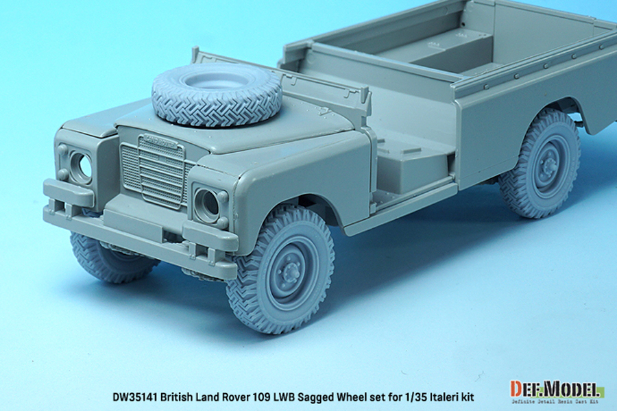 Dieses Radsatz aus Resin im Maßstab 1:35 besteht aus vier Rädern sowie einem Ersatzrad und ist speziel für die Land Rover 109" Bausätze (6508, 6542) von Italeri entwickelt worden.