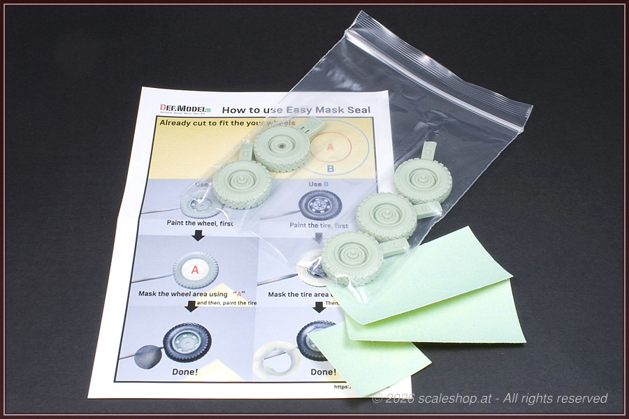Da die Reifen richtungsgebunden sind, sollte beim Anbringen auf die linke und rechte Seite geachtet werden. Zur Unterstützung beim Lackieren liegen dem Set Maskierfolie bei.