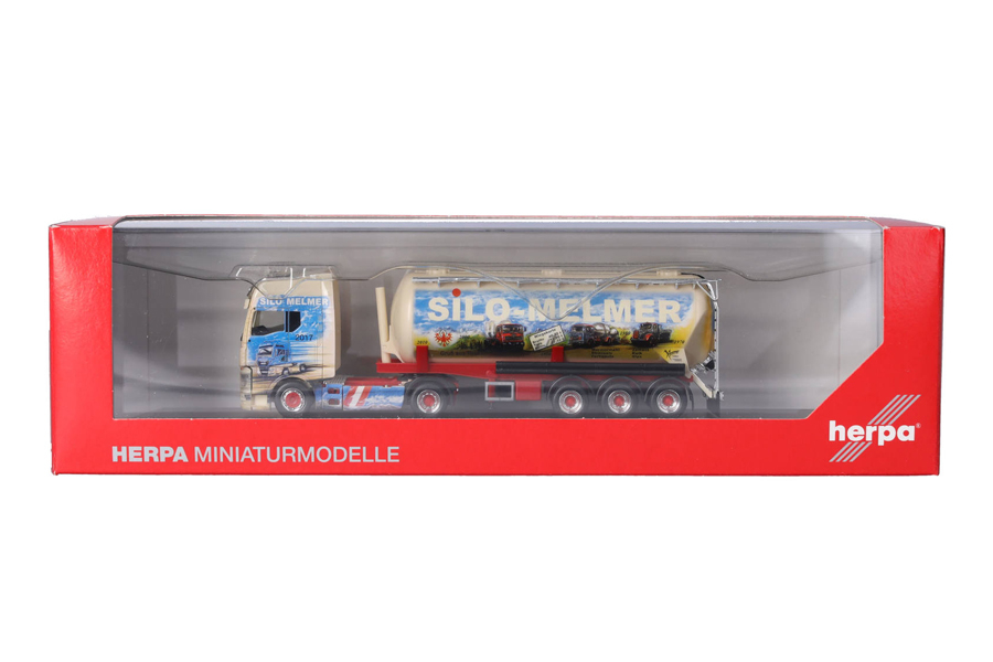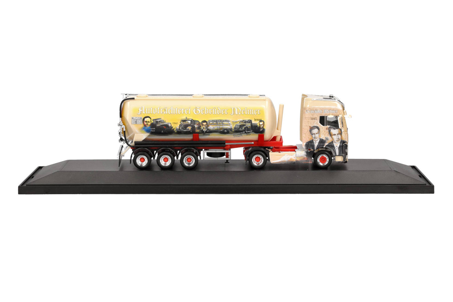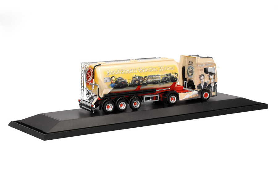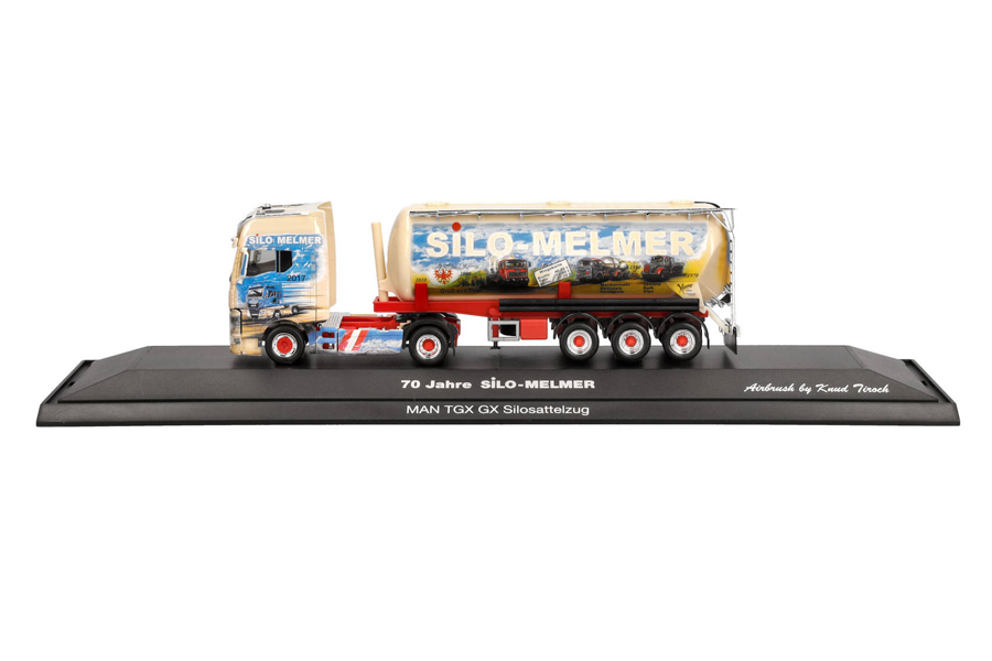 Giovanni Melmer fährt nach vielen Jahren Scania nun einen MAN TGX GX vor dem bekannten Siloauflieger. Das Jubiläumsfahrzeug wurde mit viel Liebe zum Detail und der sehr aufwändigen Bedruckung in einer einmaligen Auflage in der bekannten Vitrinenverpackung angeboten.